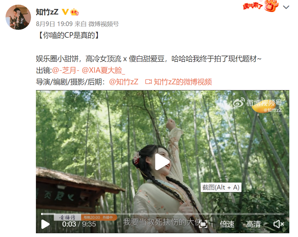 《长公主在上》的“女A男O”CP之所以能快速得到网友响应,也是因为知竹本身就是资深网文爱好者,深知网友high点。她曾在一篇访谈中提到,自己做短视频的第一步就是“寻找一个自己比较喜欢的人设搭配,然后为他们找点”。