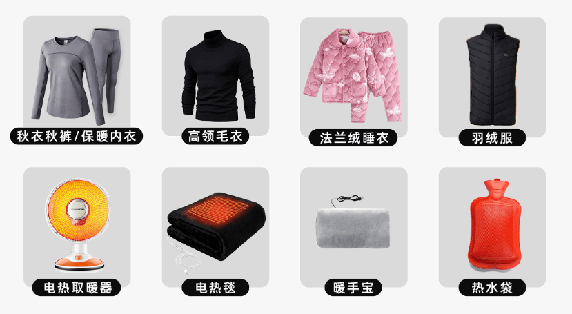 在空调、取暖设备还未普及的年代,中国人过冬讲究“物理保暖”,秋冬家用和穿着上常备“八大件”:内穿的秋裤、中层的高领毛衣、外穿的羽绒服、睡觉时的法兰绒睡衣,以及家里摆着的取暖器、电热毯,冬天上课捂手、晚上上床捂脚的暖手宝和热水袋。