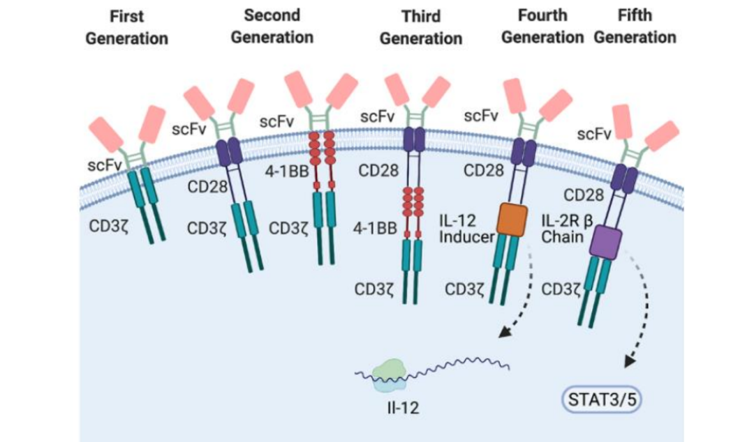 纵观整个CAR-T 发展史,根据“发动机”的差异,CAR-T 技术出现了5代产品。
