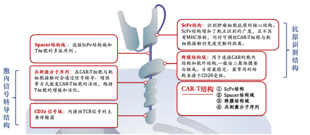 在这里我们有必要介绍一下CAR-T细胞的组成结构。一个CAR-T 细胞主要有4部分组成:抗原受体结构、Spacer 结构域、跨膜结构域、共刺激分子序列。