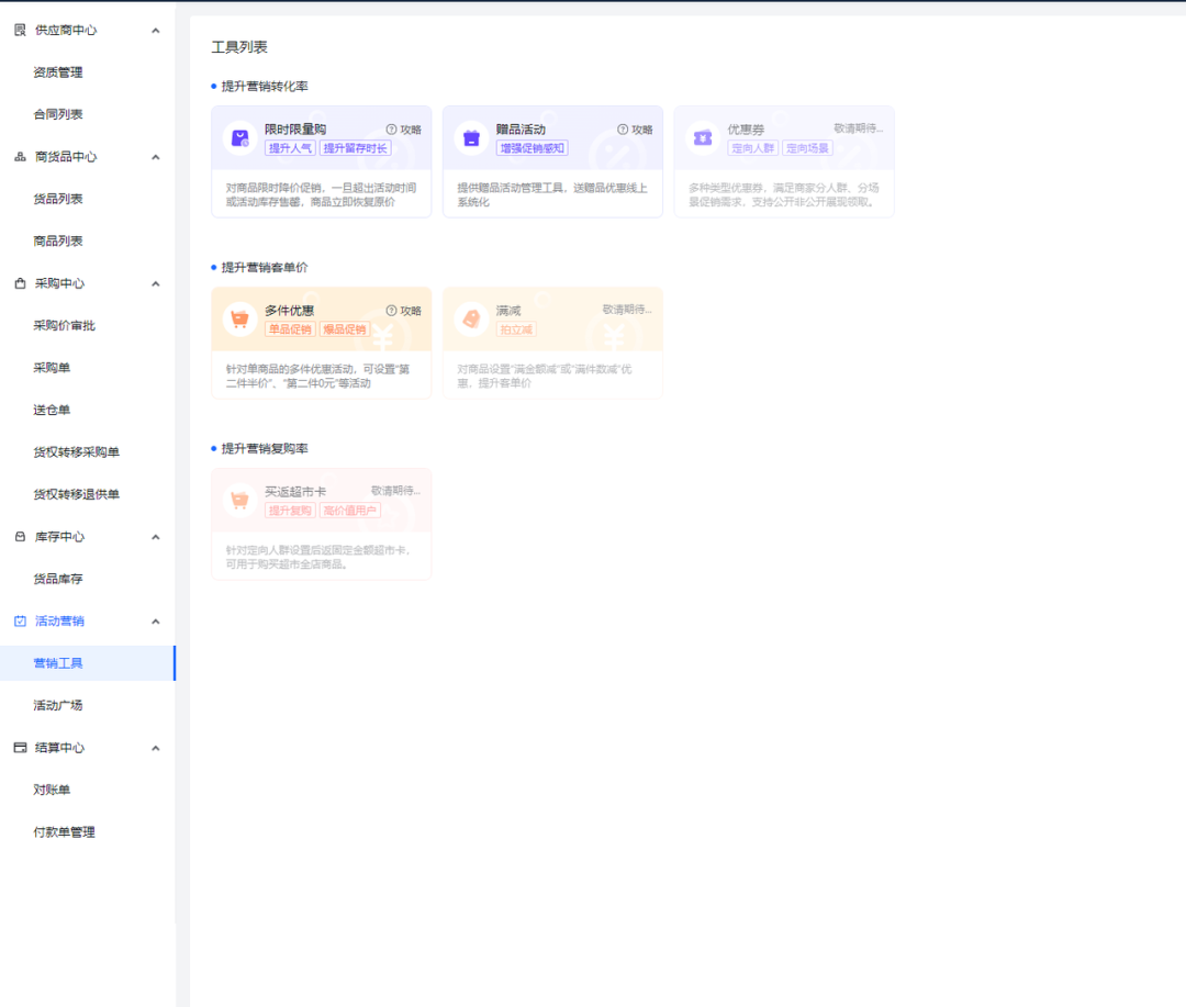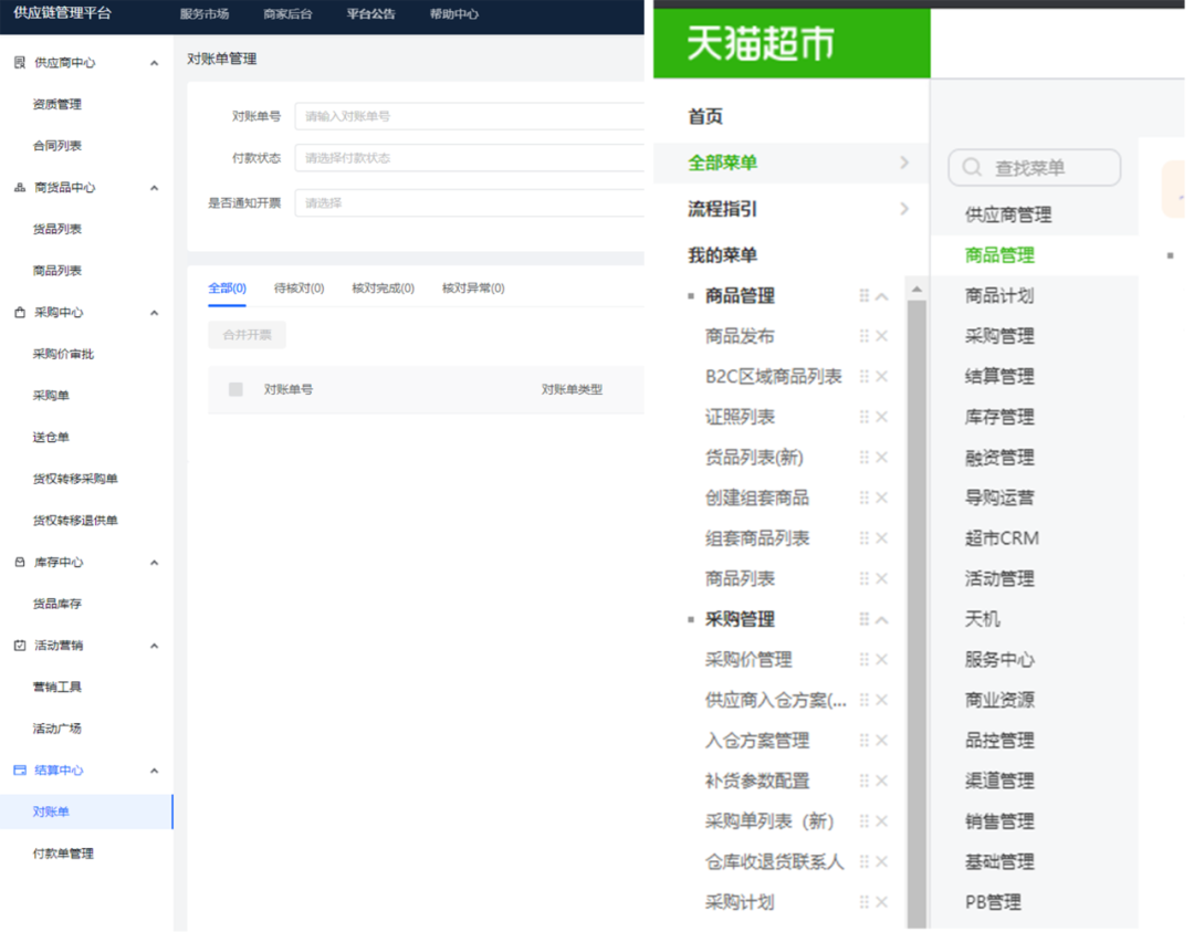 亿邦动力对比了同一个日用品商家在天猫超市和抖音超市的后台发现,抖音超市仅开放了供应商管理、商货品中心、采购中心、库存中心、活动营销和结算中心等基础“进销存”的功能模块,较天猫超市缺少了类似超市CRM、天机等针对用户和经营的数据分析模块。