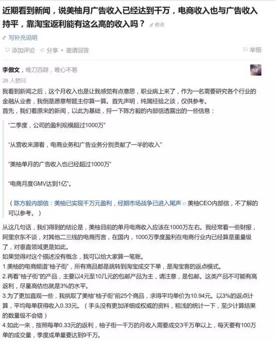 然后,就有了也不知道是谁cosplay 的一位知乎网友,条分缕析地指责美柚数据造假,说如果美柚月广告收入达到了一千万,推算其注册用户将达到18亿。