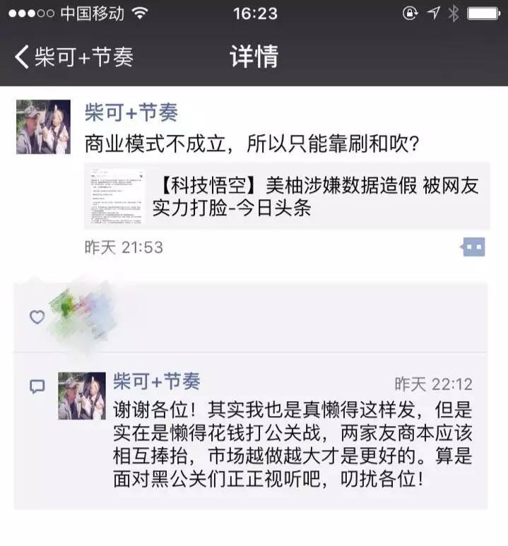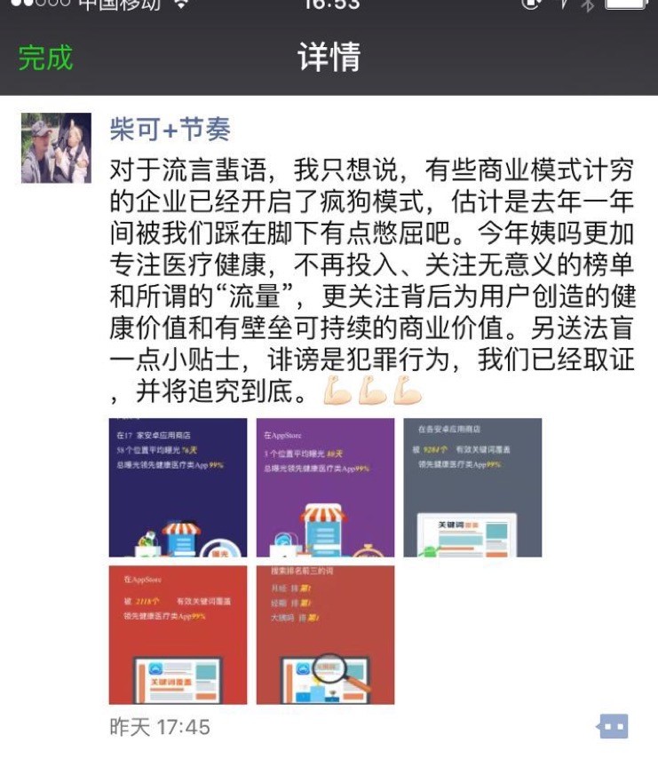 柴可在朋友圈回应了那条关于“大姨吗融资BP泄露,被指数据造假欺诈投资人”新闻,说竟品开启了疯狗模式。不过狂犬病这事儿,也是传染的。