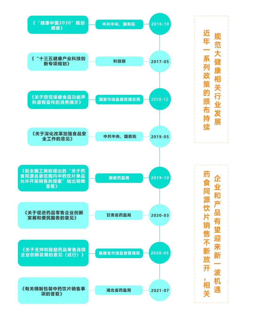 来到2018年,国家市场监督管理总局颁布的《防范保健食品功能声称虚假宣传消费提示》,以及2019年中共中央、国务院颁布的《深化改革加强食品安全工作的意见》都在进一步整治和规范保健食品市场,为大健康相关产业营造了良好的发展环境。