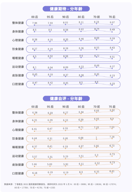 据丁香医生公布的《2022国民健康洞察报告》显示,人们对健康期待值的平均分为8.04,但对于自己的健康状态自评平均分仅有6.33,00后到80后年轻一代的各项健康自评分更是明显低于70后人群的健康自评分,其中睡眠、皮肤、口腔等方面的健康问题最为突出。