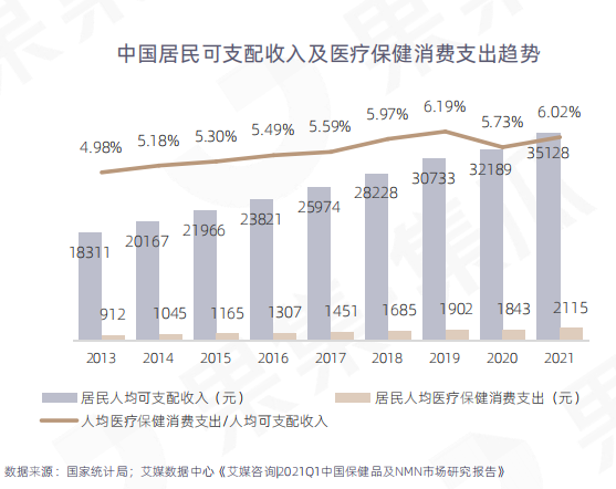 据国家统计局数据显示,在我国经济实力上升,综合国力加强的背景下,中国居民的可支配收入持续增长,从2013年的18311元上升到2021年的35128元,而用于医疗保健的消费支出也从912元上升到2115元。