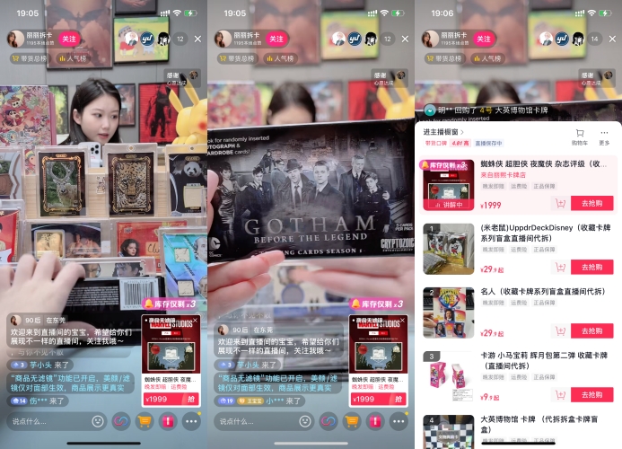 同样的,用户在直播间下单,等待主播叫号替你拆卡。你应当见过那些人气IP精美的典藏卡片,上面刻印了其中的主要角色,如果是真人IP,也许旁边还有拓上去的签名。有《海贼王》《火影忍者》《名侦探柯南》这样的动漫大IP,《权力的游戏》《哈利波特》《行尸走肉》这类影视IP,也有大英博物馆、好莱坞影视名人这类偏现实向的IP。