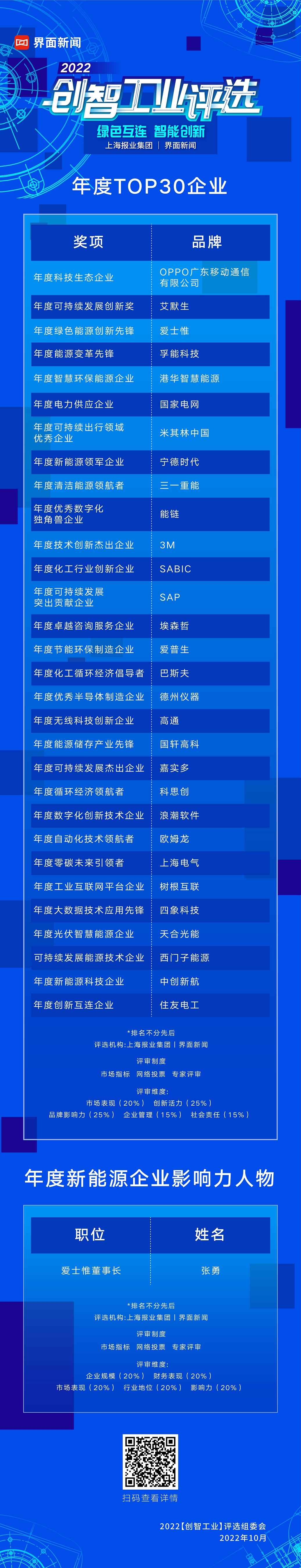 2022【创智工业】评选旨在通过界面新闻在财经媒体中的领先影响力,聚焦数字化与“碳中和”时代下的产业升级与变化,对中国工业在蜕变当中涌现的创新企业、产品及服务进行表彰,共助绿色创新、智能智造,推动可持续时代的新发展。