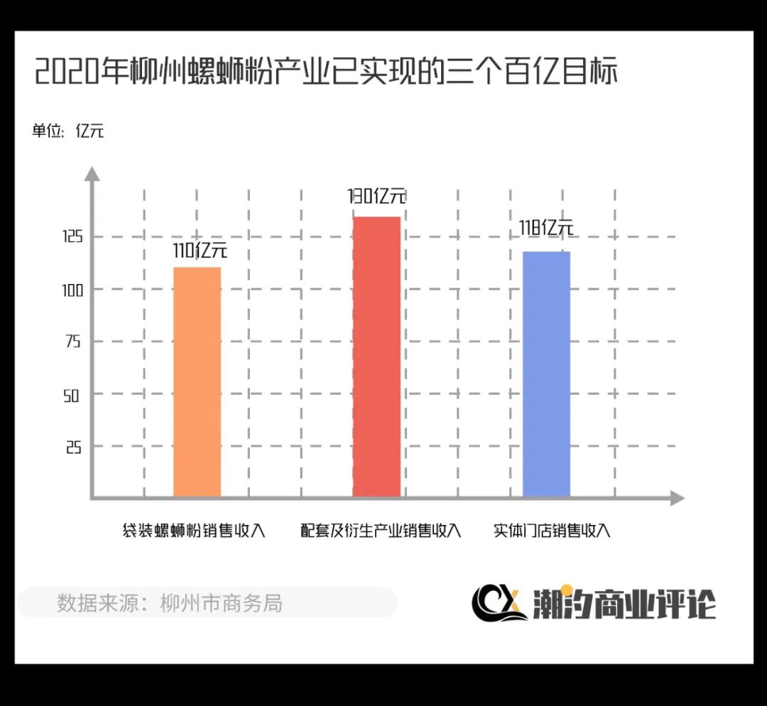 2012年,螺蛳粉凭借热播的《舌尖上的中国》在全国打开知名度,在柳州的工业思维和互联网的流量加持下,螺蛳粉的市场增长曲线一路高歌,势如破竹。根据柳州市商务局的数据显示,2020年柳州螺蛳粉产业已实现三个百亿的目标:袋装螺蛳粉销售收入110亿元,配套及衍生产业销售收入130亿元,实体门店销售收入118亿元。不难发现,实体门店销售具有和袋装螺蛳粉同样广阔的市场,为何跑不出像线上零售品牌一样吸引各路玩家入局的好成绩?