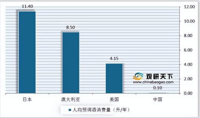 根据数据显示,2019年日本、澳大利亚、美国人均预调酒消费量分别为11.4升/年、8.5升/年、4.15升/年,我国人均预调酒消费量仅达0.1升/年。