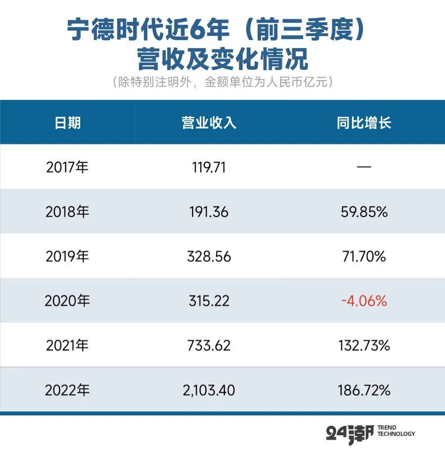 第一维度,首先在营收层面,2022年前三季度宁德时代合计创收2103.4亿元,同比增长186.72%,这是宁德时代连续第二年刷新营收历史新纪录。