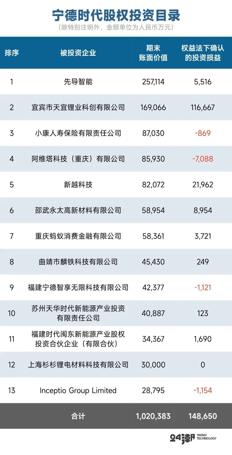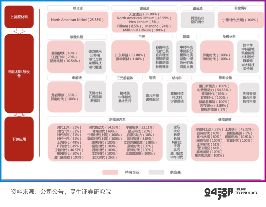 另据24潮团队统计,截止2022年6月末,宁德时代长期股权投资金额为141.88亿元,其他权益类投资金额为160.46亿元,两者合计为302.34亿元。其主要联营企业还包括天宜锂业(天华超净子公司)、曲靖麟铁(德方纳米子公司)、江西升华(富临精工子公司)、常州锂源(龙蟠科技子公司)等,合作伙伴均为上市公司,且均占据细分领域头部位置。