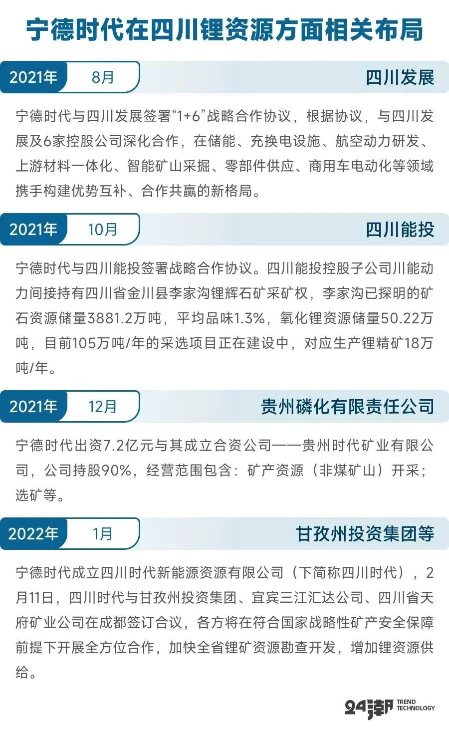 事实上,从各细分领域的投资规模上,我们可以看到上游锂资源领域无疑是宁德时代最为看重的,据24潮统计,其在锂资源领域的投资已超百亿规模,根据东吴证券测算,宁德时代在上游锂资源的系列产业布局,预计23-24年逐渐释放产能,对应300GWHh+电池需求,远期规划庞大,有效保证供应链安全。