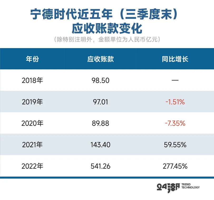 如下表所示,截止2022年9月末宁德时代应收账款规模达历史新高的541.26亿元,同比增长277.45%,而这远超同期营收186.72%的增幅。