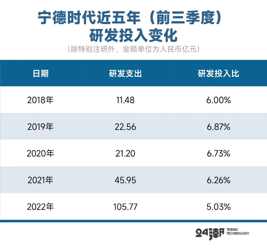 据24潮统计,宁德时代研发投入规模至少已经连续8年(2015-2022年)保持高速增长趋势,2022年前三季度其研发投入规模更是首次突破100亿大关,达105.77亿元,同比增长130.18%。