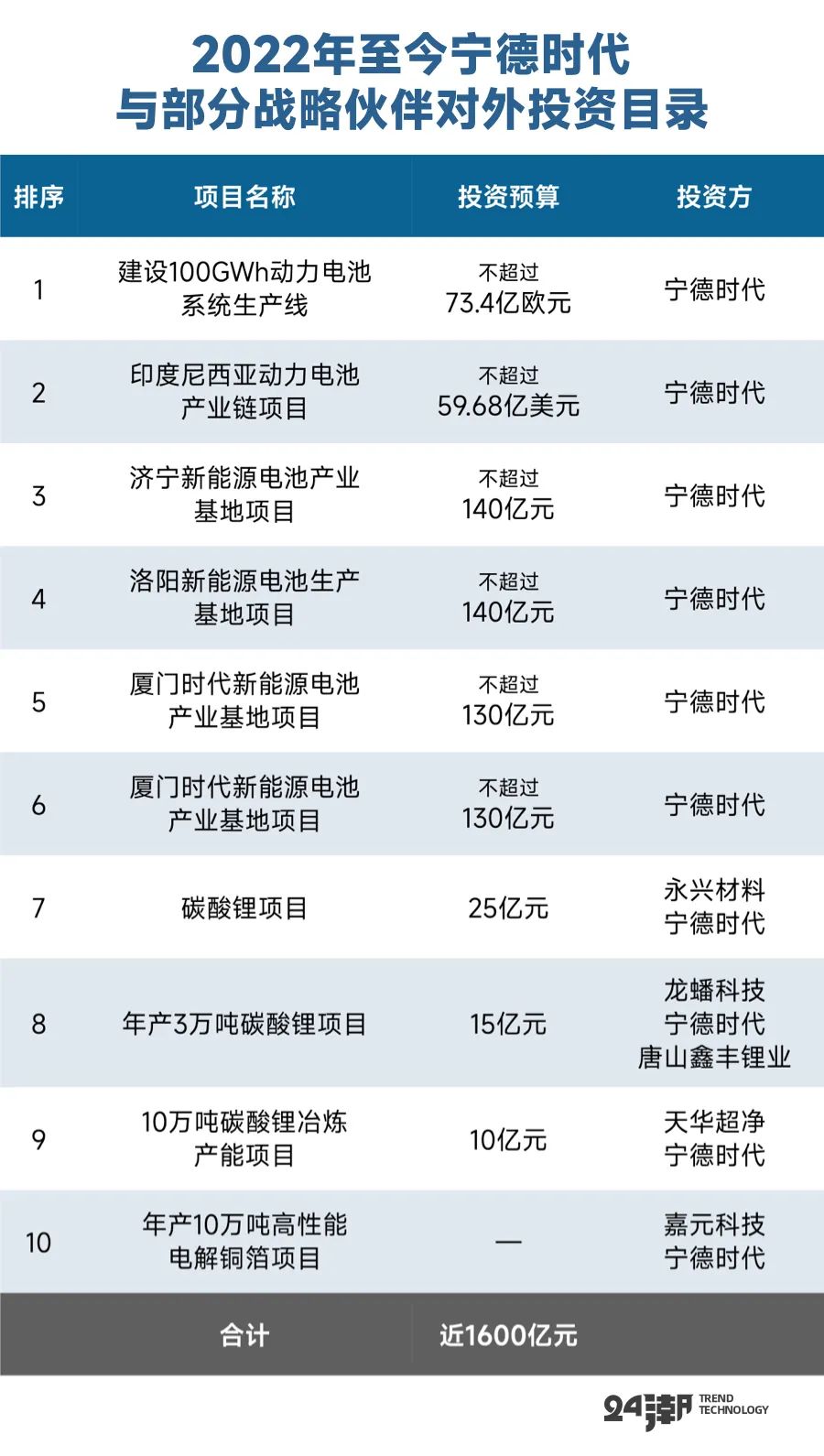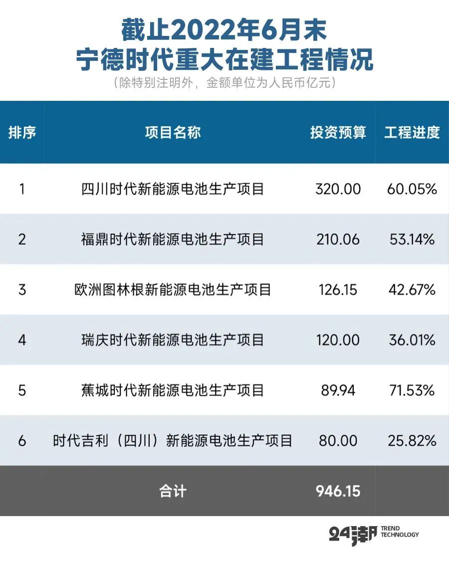 目前,宁德时代至少6个重大工程进入执行、施工阶段,仅这6大在建工程总投资预算合计约为946.15亿元。