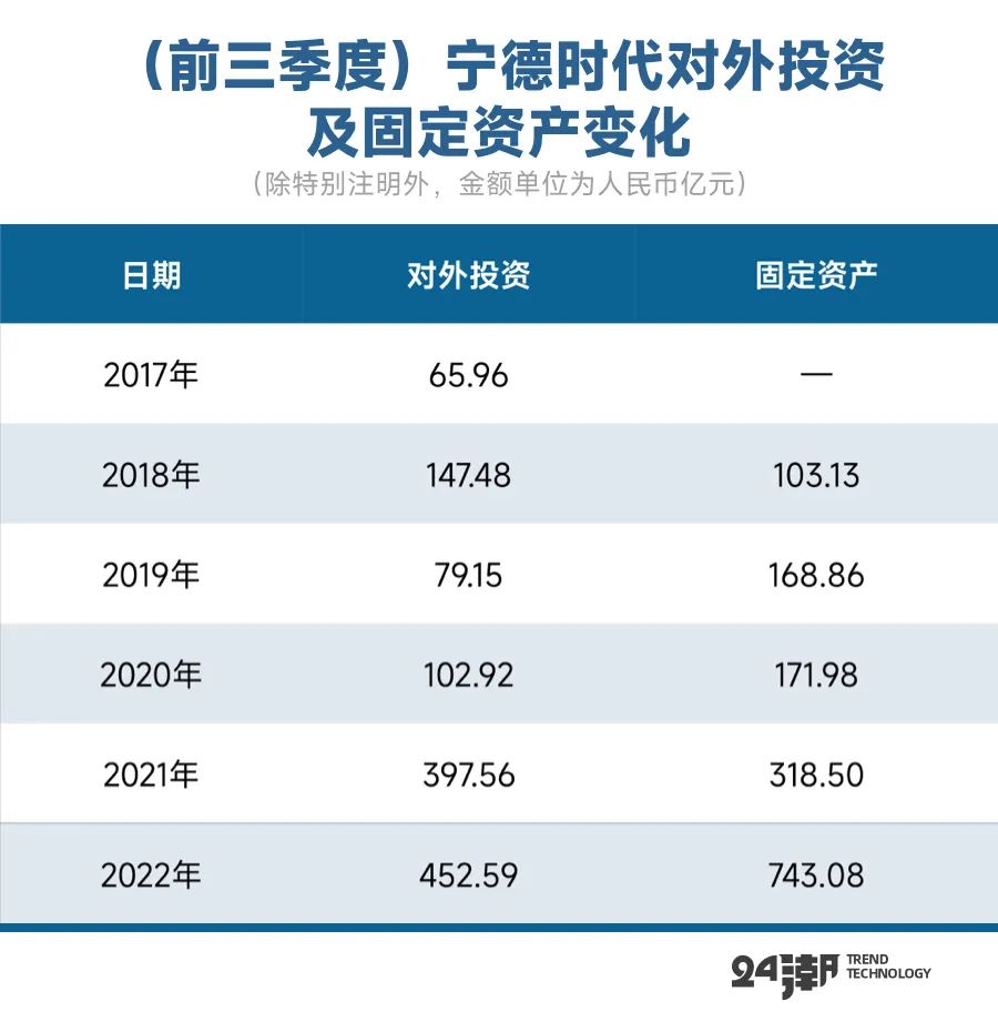 据24潮统计,宁德时代前三季度对外投资达到史无前例的452.59亿元,其中近80%资金用于 “购建固定资产、无形资产等长期资产”,在强力投资下,截止9月末宁德时代固定资产规模已增至743.08亿元,较2021年末增长了80.03%。