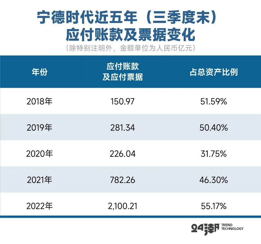 据24潮统计,宁德时代 “应付票据及应付账款” 规模已经连续8个季度刷新历史最高值,截止2022年9月末其 “应付票据及应付账款” 规模已达2100.21亿元,较去年同期增加了1317.95亿元,增幅达168.48亿元,要知道2022年前三季度宁德时代 “营业成本” 也不过1704.81亿元,其对上游供货商的话语权已不言而喻。