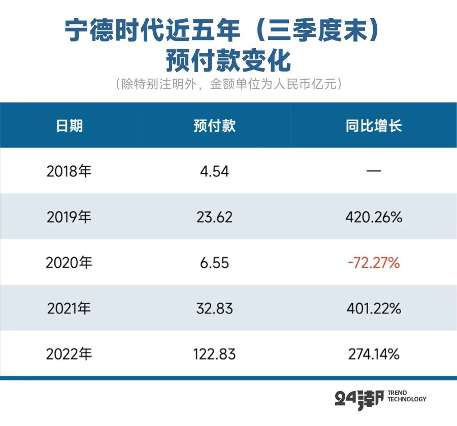 如下表所示,截止2022年9月末宁德时代预付款规模达122.83亿元,同比增长274.14%,这已经是其连续4个季度刷新历史最高记录。