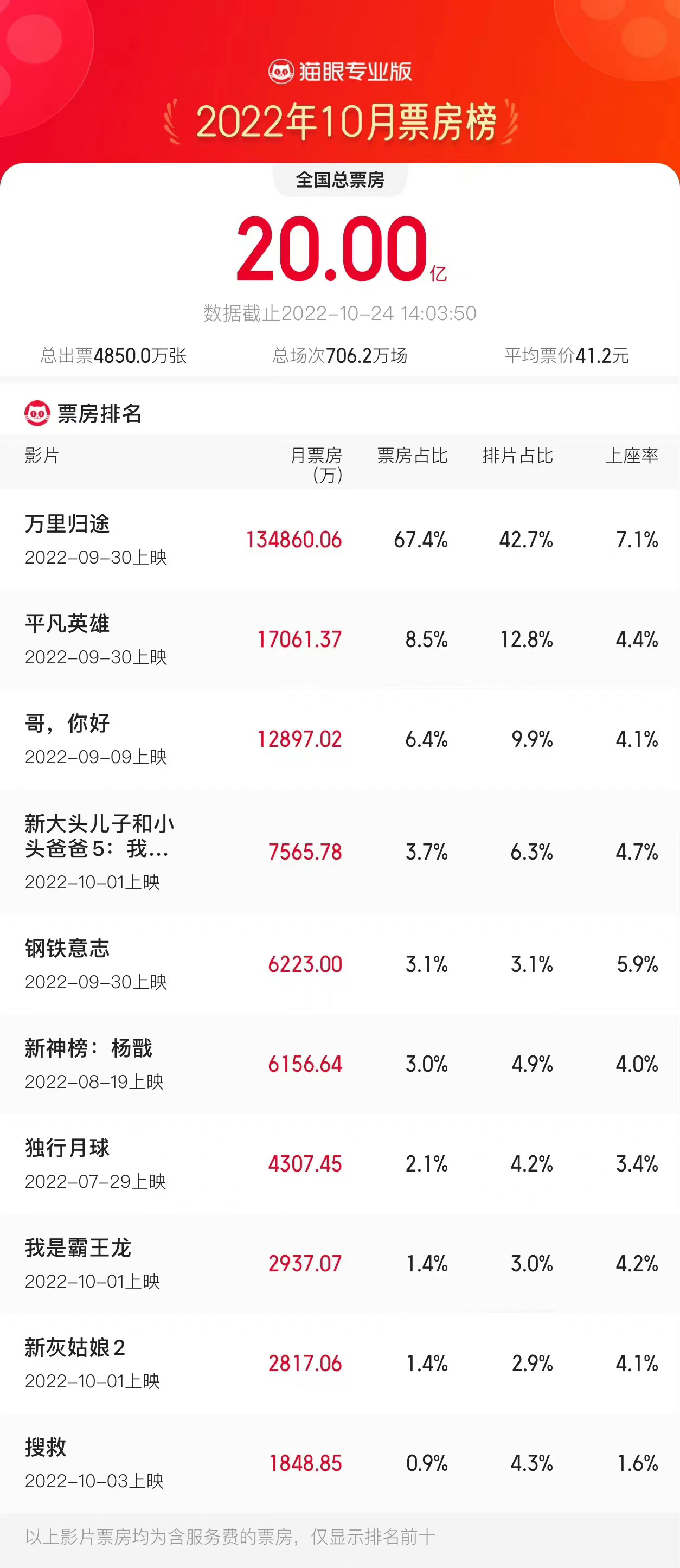 猫眼专业版数据显示,10月24日14时03分,2022年10月总票房突破20亿元。《万里归途》《平凡英雄》《哥,你好》分列10月票房榜前三位。