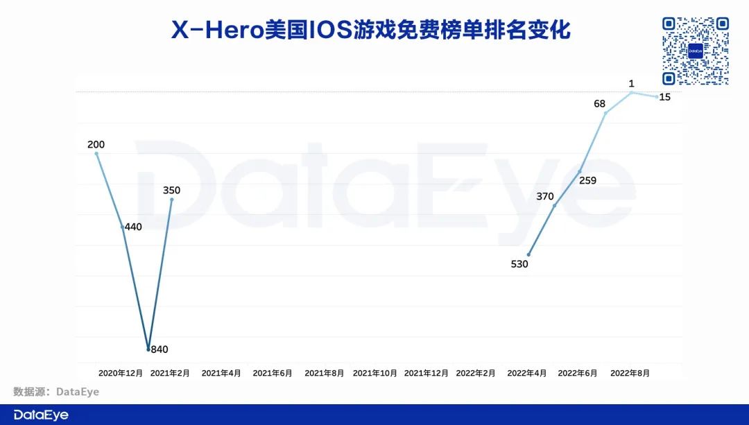 游戏榜单排名:从2020年上线直至今年5月,《X-Hero》在iOS免费榜表现一直在百名开外。而从今年5月起,游戏一路飙升至美国免费榜Top1(期间因为支付问题下架因此没排名)。