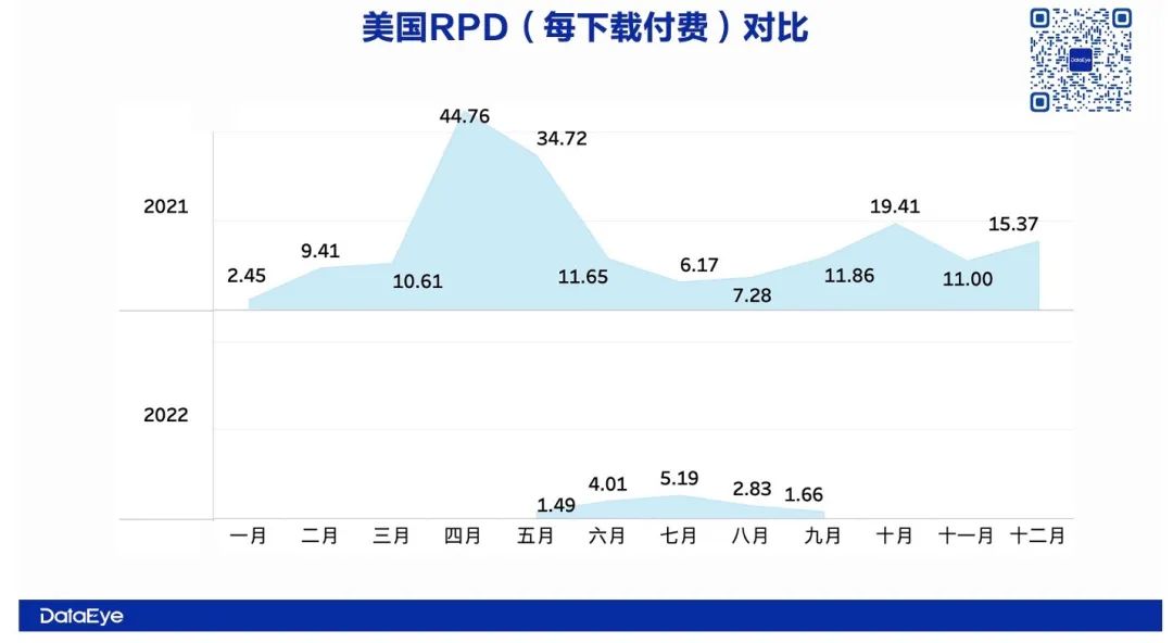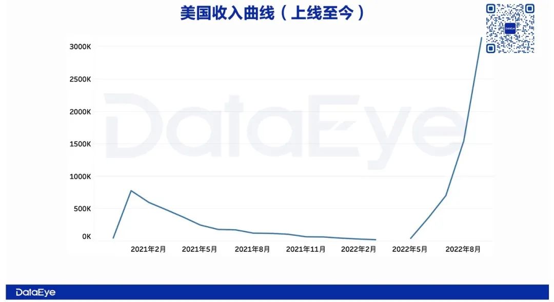 收入方面,除了在2020年末游戏刚上线时有一小波升高外,2022年5月开始至今,该游戏收入呈爆发式增长。今年美国5月-9月的短短5个月时间总收入,为今年5月前约2年时间美国总收入的1.67倍。