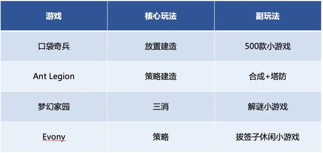 同样用副玩法吸引新用户的可不止《X-Hero》一个。市场上已经有很多中重度游戏开始内置副玩法,国内《口袋奇兵》更是加了500款小游戏,形成专门的小游戏中心。