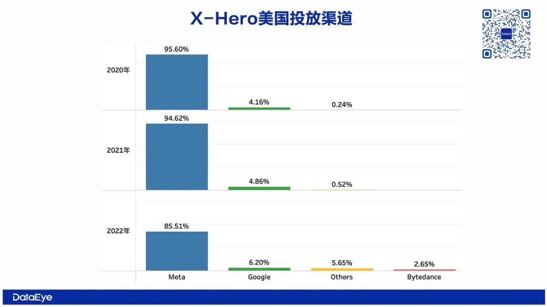 游戏上线以来,美国买量渠道无明显变化。2020、2021年基本一致,2022年Meta旗下媒体占比提升。