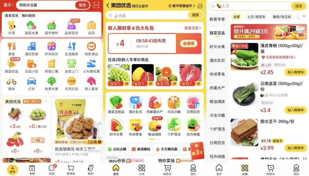 点进美团APP可以看到,“美团优选”按钮位于首页,且信息流推荐的靠前位置也出现了“美团优选”相关商品展示,与之相伴的是“更优惠”、“明日达”等标签,与“明日达超市”定位相符。