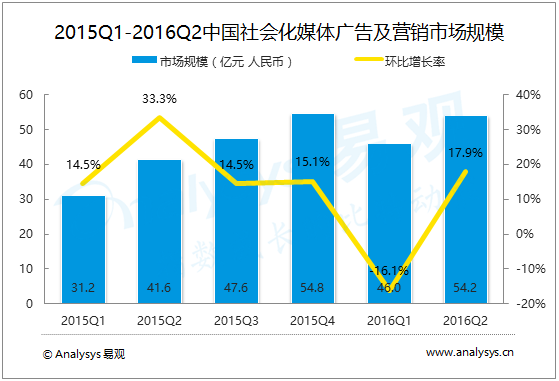 据Analysys易观发布的《中国社会化媒体广告及营销市场季度监测报告2016年第2季度》数据显示,2016年第2季度,中国社会化媒体广告及营销市场规模达到54.2亿元人民币,较2016年第1季度环比增长17.9%,较2015年第2季度同比增长30.3%。从市场竞争格局来看,2016年第2季度,腾讯、微博保持中国社会化媒体广告及营销市场领军地位。