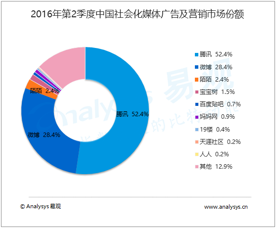 从2016年第2季度中国社会化媒体广告及营销市场份额情况来看,腾讯凭借社会化媒体产品矩阵以及海量用户流量的优势以52.4%的市场份额稳居领先地位;其次为市场份额占28.4%的微博,两者占整体市场规模八成以上。