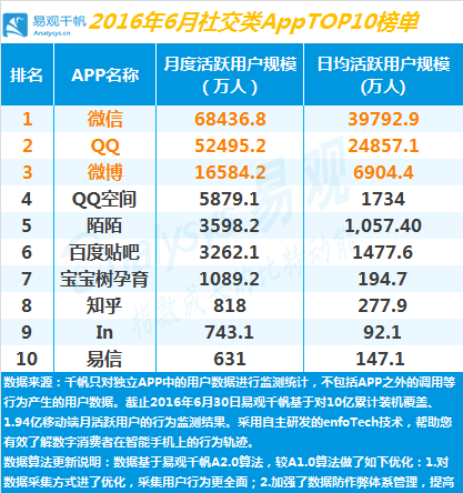 Analysys易观分析认为,社会化媒体广告及营销价值的不断深化,来源于社会化媒体较强的用户渗透率以及厂商对于自身广告产品的精细化运营程度加深。根据Analysys易观千帆数据监测,2016年6月,微信、QQ、微博月度活跃用户规模分别达到了68436.8万人、52495.2万人、16584.2万人。