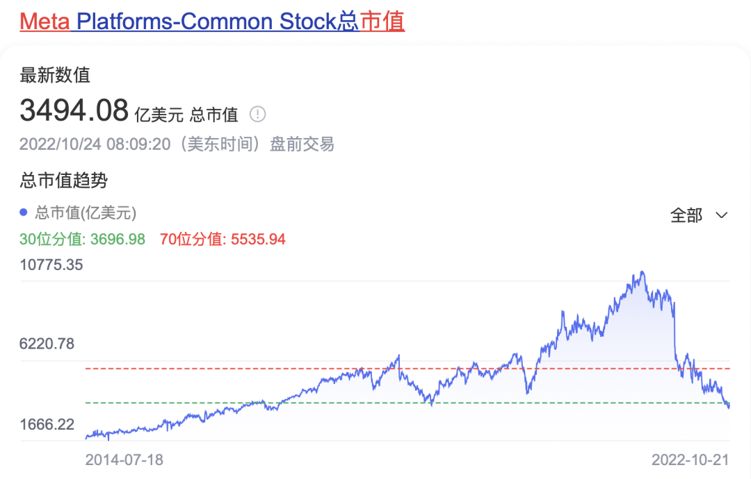 随着各类消息应声而降的是Meta一泻千里的市值,截至10月24日美股盘前交易时,Meta的股价已经跌至3494亿美元,比其去年10月28日宣布改名Meta前的9128亿美元市值,整整下降了61.6%。