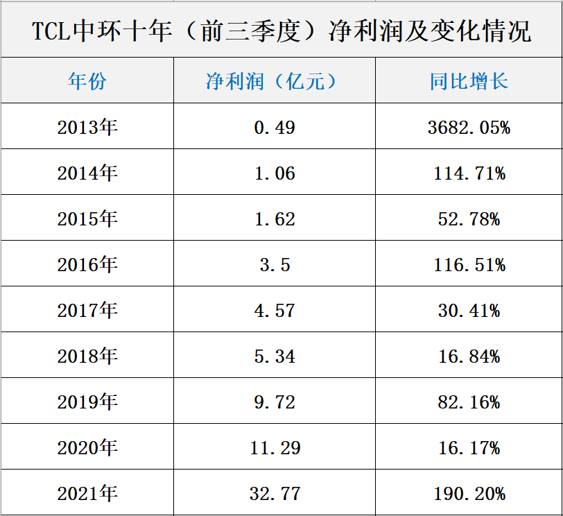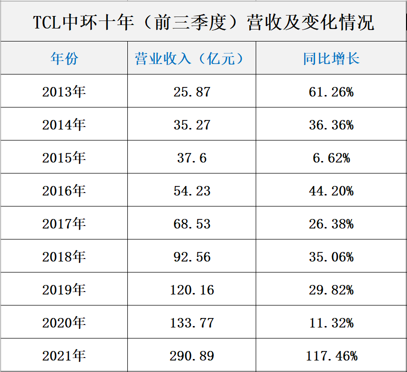 第一大记录,根据TCL中环财报披露,2022年前三季度实现营收498.45亿元,同比增长71.35%,而这已是TCL中环连续第十年实现正增长,且是连续十年刷新营收新纪录。