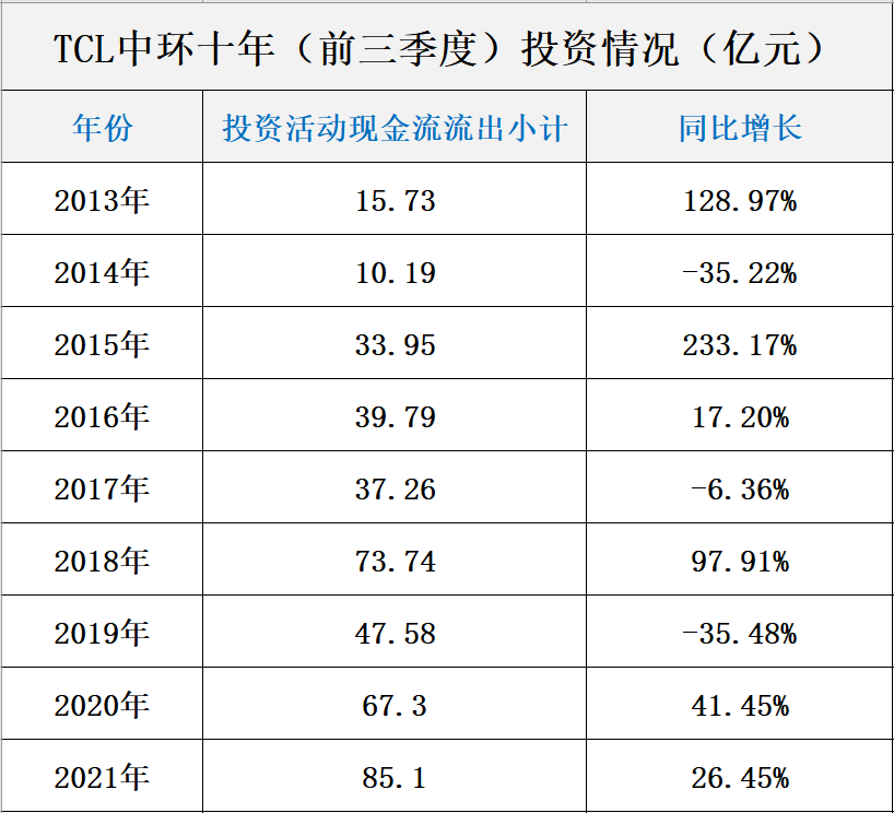 第四记录,据财报披露,2022年前三季度TCL中环“投资活动现金流出小计”(对外)达到了史无前例的315.80亿元,同比增长271.09亿元,这几乎与“2013年-2020年”前三季度对外投资之和相等。