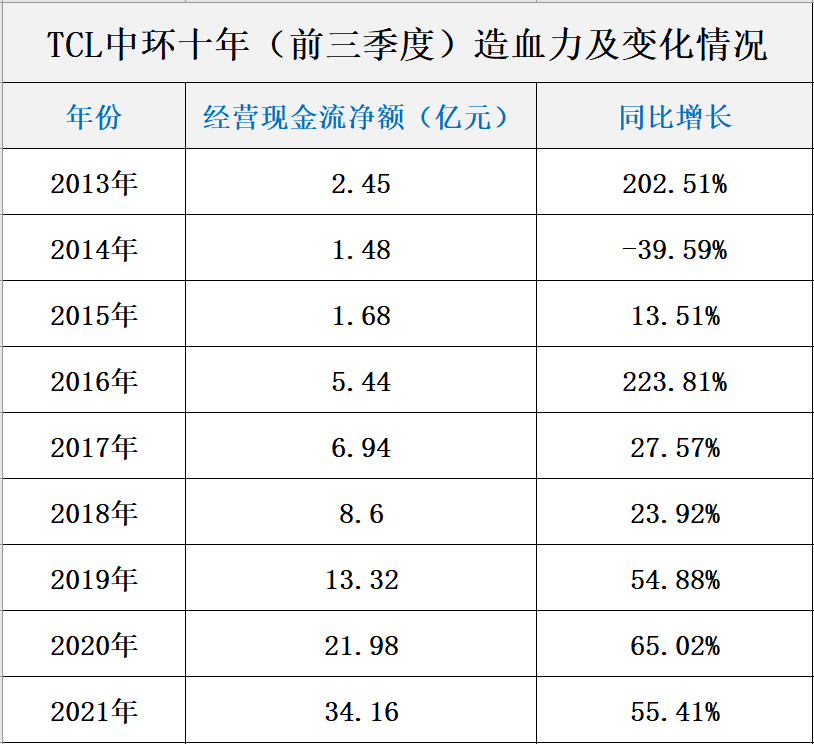 第六大记录,TCL中环之所以能够在产业端不断“攻城略地”,很大程度得益于强大造血力。据黑鹰光伏统计,2022年前三季度TCL中环“经营活动产生的现金流量净额”为42.42亿元,同比增长了24.18%,这已经是其连续8年保持增长趋势,且是其第7年刷新自身造血力新纪录。