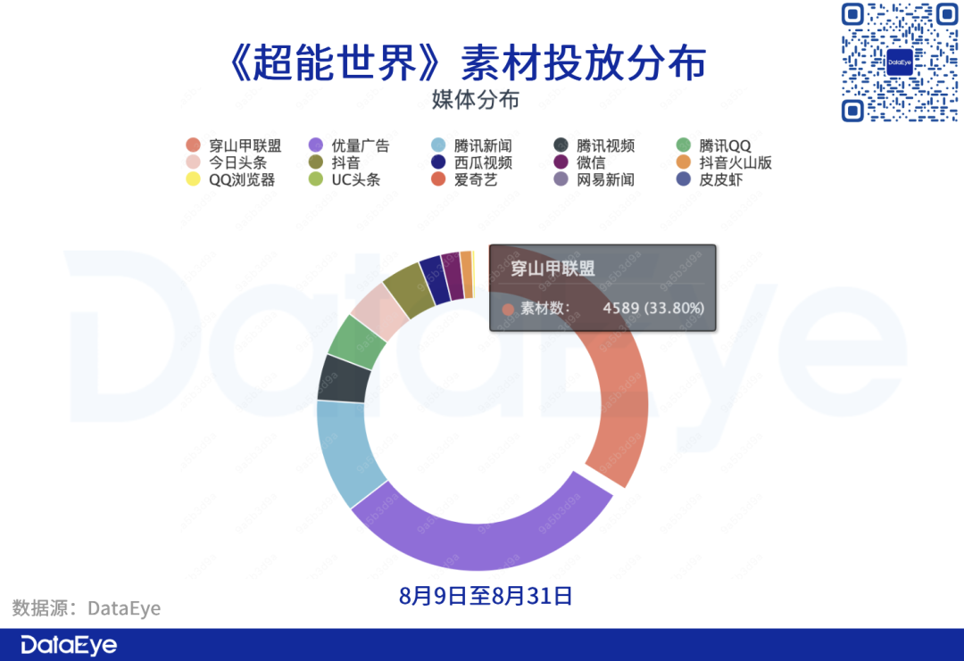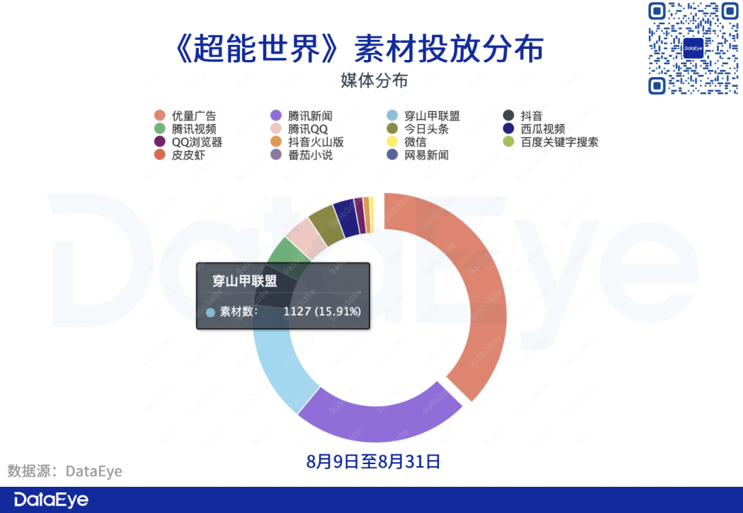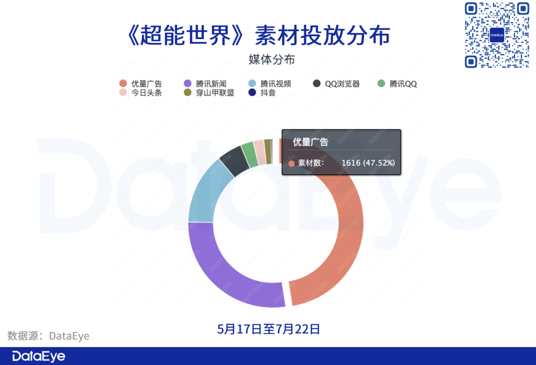 投放平台方面,优量广告、腾讯新闻仍占据投放量前两名的位置,但《超能世界》在该阶段逐渐重视起字节系渠道的投放,穿山甲联盟的投放占比已经来到第三的位置。