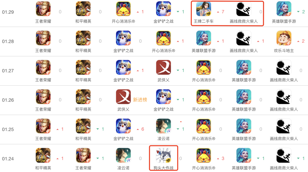 把目光放到2022年一月份iOS免费榜榜单,彼时榜单前十出现了——《圣魂纷争》、《狗头大作战》、《画线救救火柴人》、《我的停车场》、《二手停车场》等产品。