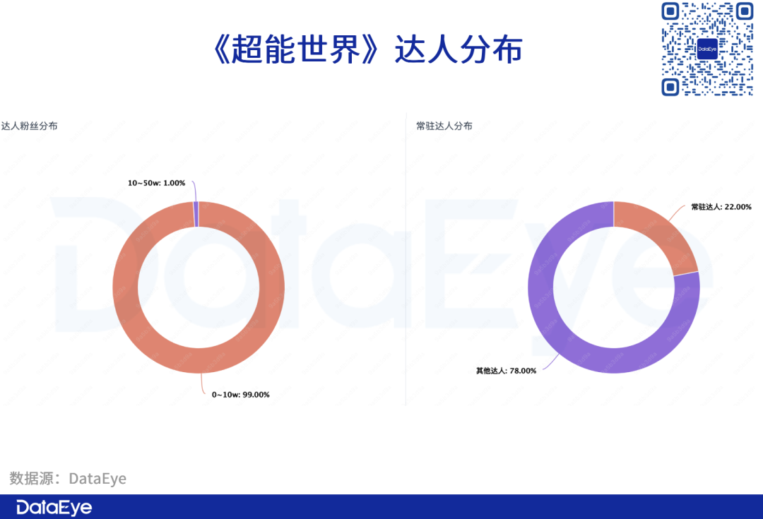 直播达人选择上,《超能世界》项目组以中腰部达人为主,0-10W粉丝的达人占比约为99%;而100W以上的头部主播占比仅有1%,项目组还是希望通过中腰部主播带动效果传播。