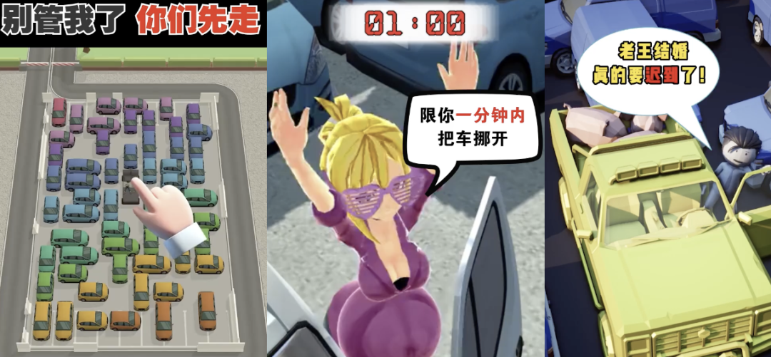 除此之外,该游戏也会着重凸显“别管我了,你们先走”、“限你一分钟把车挪出去”、“结婚要迟到了”等“焦急感”强烈的文案。同时,在素材画面中,也会重点以“不断失败”的操作,隐性的向玩家传递“你来也不行”的信息,期望勾起受众挑战欲。