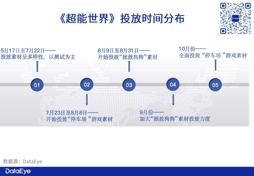 DataEye研究院认为,《超能世界》之所以能在iOS免费榜中迎来飙升,或许与其营销举措的变化有关。从5月17日开始,《超能世界》的营销投放可以分为5个阶段来看——
