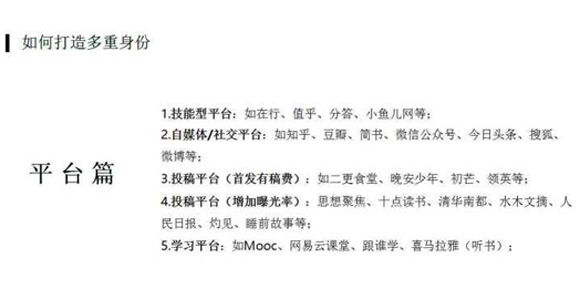 可以跟兴趣进行结合,比如看看自己是否特别喜欢很漂亮的东西,会画思维导图,会做手帐,或是特别喜欢唱歌,通过这些去吸引更多人对你的关注。比如我会通过看书学到一些演讲技巧,然后更多把“会演讲”变成自己身上的一个标签,而这就是跟现有工作完全不同的身份。