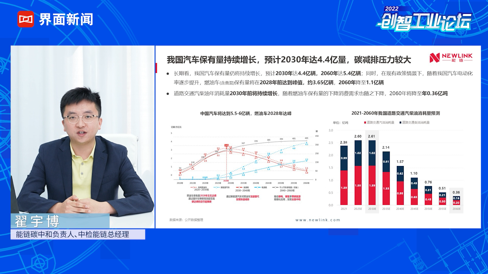 在此背景之下,由上海报业集团 | 界面新闻主办的2022第五届【界面创智工业论坛】于10月24日举行了线上云峰会。能链碳中和负责人、中检能链总经理 翟宇博发表了主旨演讲《交通能源碳中和的创新机遇与挑战》。