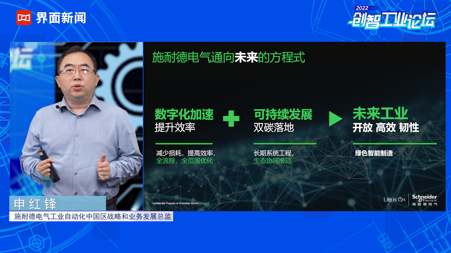 申红锋:大家好,欢迎参加2022年界面新闻主办的“创智工业论坛”,我是来自施耐德电气工业自动化战略和业务发展部的申红锋,今天我给大家分享的主题是《数字赋能,加速迈向可持续的未来工业》。