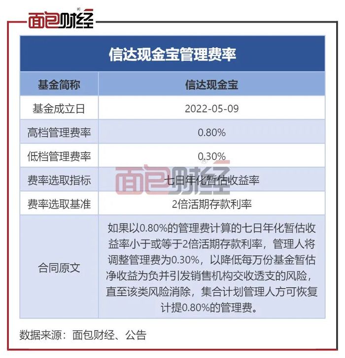 公募化转型后,信达现金宝不计提业绩报酬,同时将固定管理费率改为分档浮动管理费率。根据基金合同,当产品七日年化暂估收益率小于或等于2倍活期存款利率(约0.7%),则收取0.3%管理费;否则按0.8%收取管理费。