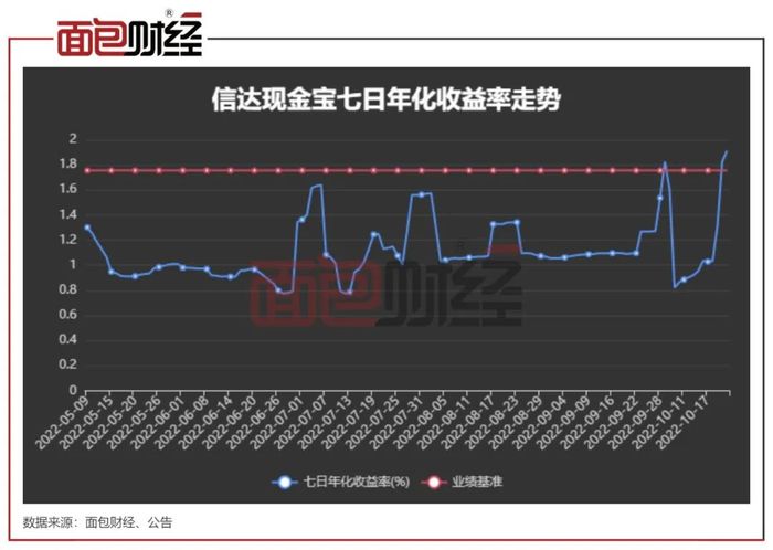 基金合同显示,该产品的业绩基准为七天通知存款利率(税后)*1.3(年化约1.755%)。转型5个多月以来,该产品的业绩走势波动较大,多数时点产品的七日年化收益率跑输其业绩基准,表现较差。