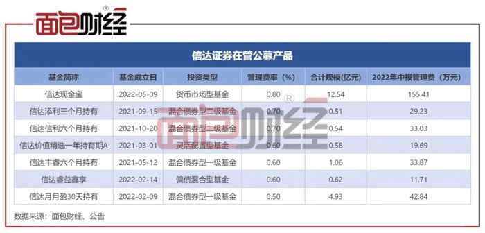 目前,信达证券在管公募产品有7只(初始基金口径),总规模约20.78亿元,2022年上半年共收取约326万元管理费。其中,信达现金宝是成立时间最短的产品,也是公司唯一的货币型产品。