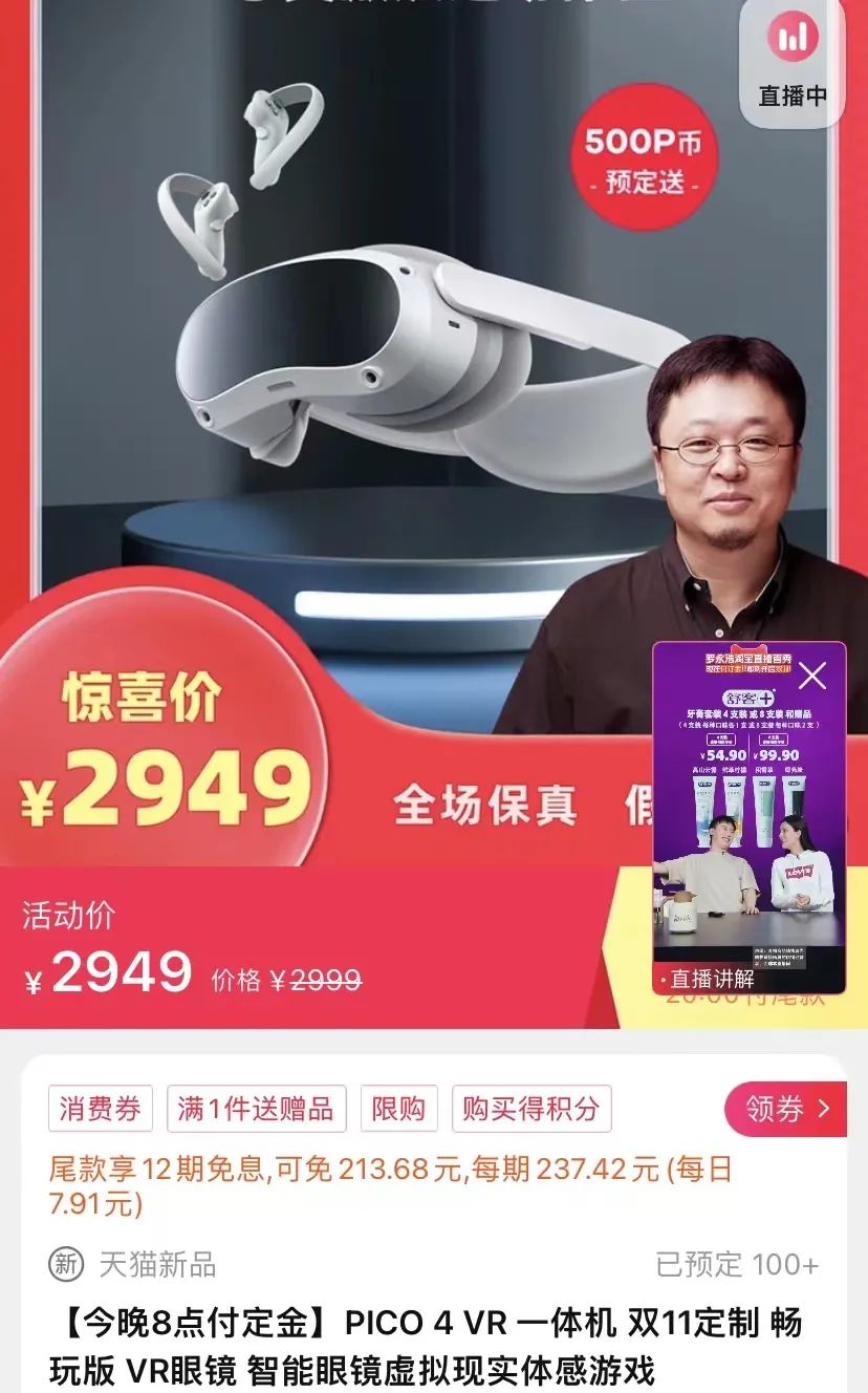 就以罗永浩直播间出现的PICO 4头显为例,就在不久前,根据市场情报公司Sandalwood Advisors监测数据,截至10月14日,PICO 4国内市场的在线订单量超过4.6万台,其中京东销售占比为65%,天猫和抖音各占17%。而在罗永浩直播间,讲解十分钟,售价2949元的头显就能获得100+的订单量。