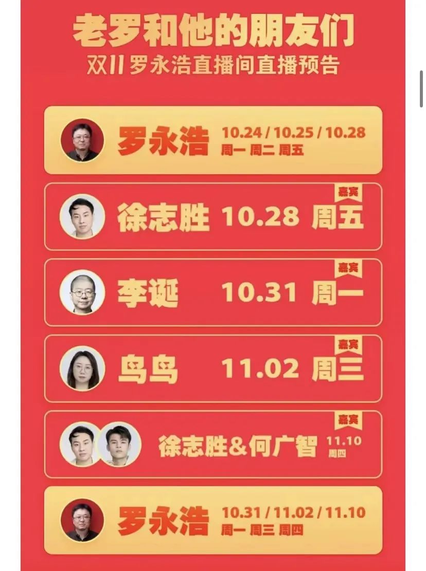 值得注意的是,在罗永浩双11直播预告中,罗永浩和他的朋友们,徐志胜、李诞、鸟鸟将先后做客直播间,而在11月10日,双十一的前一天,徐志胜和何广智将合体出现在直播间。罗永浩将分别于10月24日、25日、28日、31日,11月2日、10日出现在直播间直播。