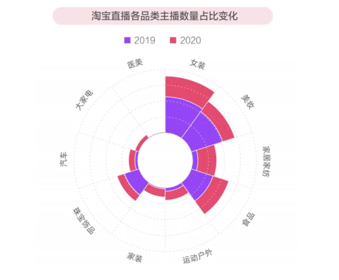 而3C数码背后的男性消费却是淘宝有意补足的短板。根据淘榜单联合淘宝直播ON MAP推出的《淘宝直播2021年度报告》显示,淘宝直播中,服饰主播和美妆主播数量最多,2019年两者占比分别为14%和12.9%。到了2020年,在这两个类目的主播数量倍数增长。这与淘宝直播以女性用户为主相关,淘宝直播的主要用户是80、90后女性。